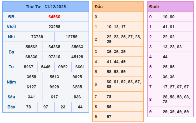 Giải đặc biệt: 64960. Giải nhất: 23258
