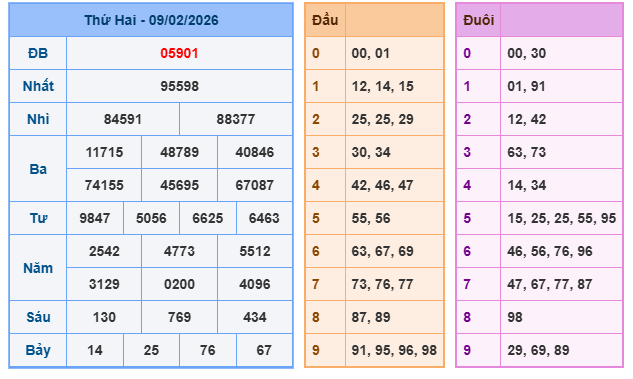 Giải đặc biệt: 05901. Giải nhất: 95598
