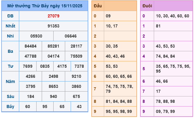 Bảng kết quả xsmb ngày 15/11/2025