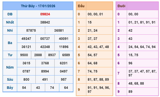 Bảng kết quả xsmb ngày 17/01/2026