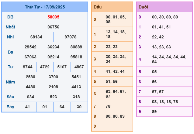 Bảng kết quả xsmb ngày 17/09/2025