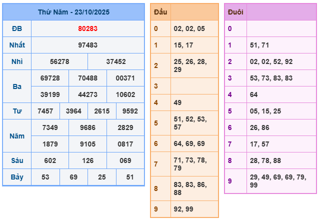 Giải đặc biệt: 80283. Giải nhất: 97483