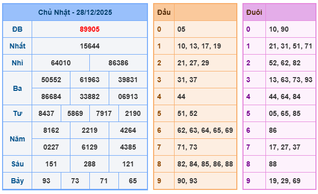 Giải đặc biệt: 89905. Giải nhất: 15644