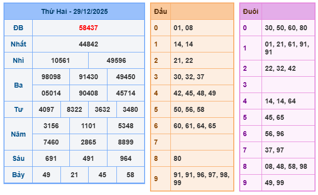 Giải đặc biệt: 58437. Giải nhất: 44842